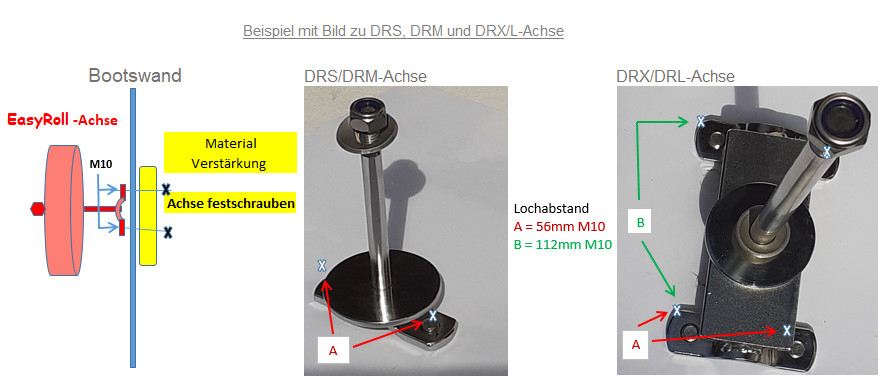 Es besteht die Möglichkeit, die Rollen selbst an einer Bootswand zu befestigen. Hierzu ist -wie auf nachstehender Skizze zu sehen- auf der Innenseite der Bootswand eine Materialverstärkung (z.B. Holz-Platte 40 x 40 x 2 cm) zu empfehlen, wobei die Schraubenlänge der zwei bzw. vier M10-Schrauben der Wand- und Verstärkungsplattenstärke anzupassen ist.